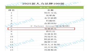 2025年9月30日,人力资源新媒体HRbrand发布“2025新人力品牌100强”榜单,易德猎头再次荣登全国品牌100强。